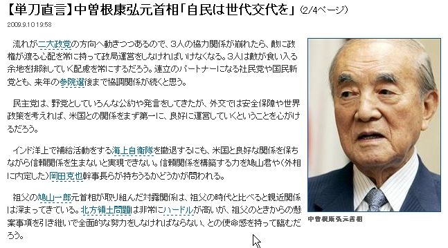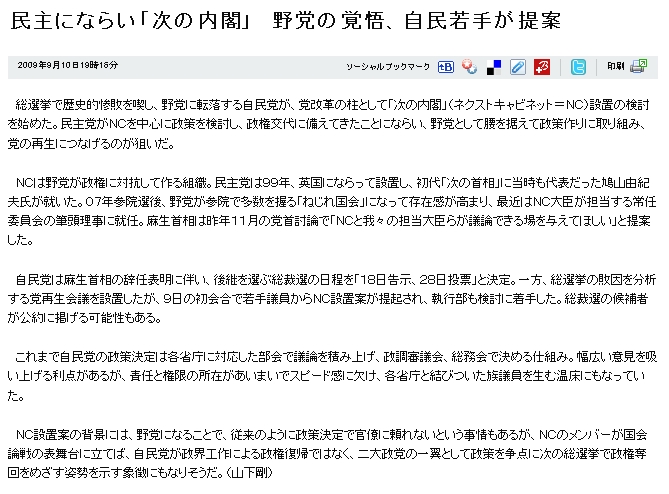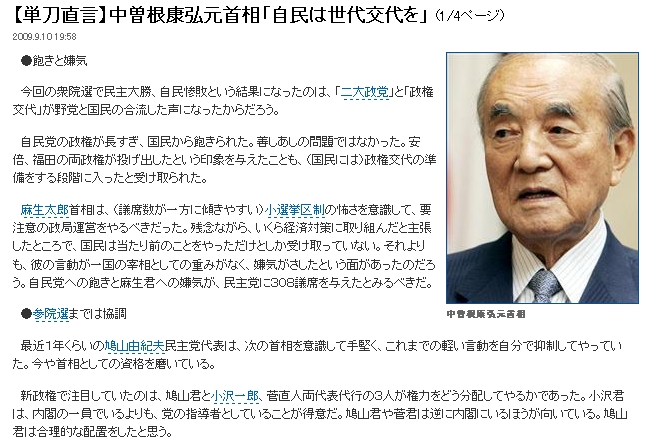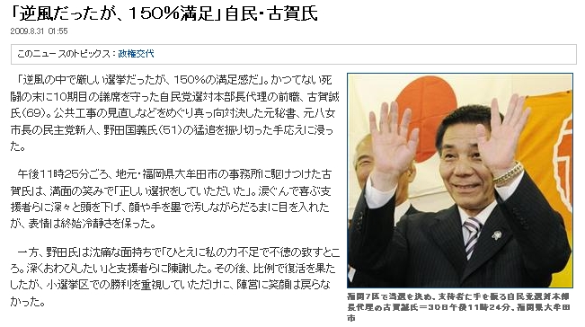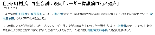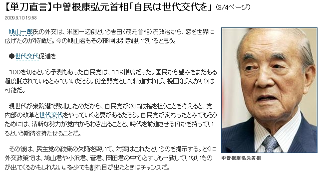もっとも自民党壊滅の張本人は古賀氏である。 選対本部長というこれまで幹事長が持つ権限を新たに認めさせて、党4役とまでいわれるようになった。その最大の目標である今回の選挙に・・・東国原勧誘で大恥をかき、挙句の果ては選挙前になって突然辞任。その無責任さは選挙後のコメントにも表れている。「逆風だったが150%満足」自らの選挙が辛勝だった事をヘーキで喜ぶその無神経さには驚いた。郵政民営化の時も反対を表明しながら、採決の際に逃げ出すし・・・ 選挙前、まだ人気のあった舛添氏へ衆院比例への鞍替えを党本部は要請したようだが・・・断られた経緯がある。当のご本人は権力へのあくなき欲望はあるようだが、野党の総裁にはなりたくないようで、もう国政には興味がないのかも知れない?2年後の東京都知事選に色気を見せていると言われている。 そんなこんなの体たらくな自民党にあって、唯一期待されているのが石破氏のようだ。今回の総裁戦、野党自民党として本当に再生できるか?という大きな試練を持たされることになる総裁。来夏にせまった参院選、勢いにのる小沢民主を相手に勝利することは並大抵ではない。。。選挙総括とともに、再生へ向けた戦える布陣を期待したいものだ。 とかなんとか、私がムキになって憤ってもなんら意味はないのだが・・・とりあえず党員ですし、個人的な総括の愚痴として(^。^;) ▼自民党再生「中堅・若手中心に」会議座長に山本氏 自民党は9日、総選挙の敗因を分析する「党再生会議(仮称)」を発足させ、初会合を開いた。座長に山本有二・元金融相(当選7回)、座長代理に茂木敏充前行革相(当選6回)を選出。新総裁を決める28日まで連日会合を開いて党再建策を検討する。党再生会議メンバー 【衆院】 ■当選7回 山本有二(座長)、古屋圭司■6回 茂木敏充(座長代理)、小池百合子■5回 大村秀章、木村太郎、下村博文、西野陽■4回 小野寺五典、梶山弘志、河井克行、新藤義孝■3回 江藤拓、菅原一秀、谷川弥一■2回 小里泰弘■1回 金田勝年 【参院】 ■3回 市川一朗■2回 佐藤昭郎、愛知治郎■1回 秋元司、佐藤正久 9月10日----------- ▼「昨年秋に選挙やっていれば」悔やむ麻生首相 首相官邸、9日午前11時5分 麻生首相が秋山昌広・海洋政策研究財団会長との面会で、ついに後悔の念を口にした。政局よりも政策・・・それはある意味で正解だが、最初の予算ができた時点ですぐに解散すべきでしたね。問題は解散直近の麻生氏の行動は総裁としての責務を果たすどころか、この結果を招いた最大の問題だと思いますよ麻生おろしは成るのか?でも書いたが 麻生氏は総理であるが、自民党の総裁でもある。総裁の立場で考えるならば、目の前に迫った選挙で自民党の議員が一人でも多く生き残れる道を模索するとしたら・・・自らが降りる事が唯一の道だと判断するはず。このタイミングで党内融和を図るべきだったのだが・・・まー今となってはどっちもどっちか?( ̄? ̄) 中曽根康弘元首相「自民は世代交代を」P1 P2 P3 P4 民主にならい「次の内閣」 野党の覚悟、自民若手が提案 と、脱派閥、世代交代、「次の内閣」設置等など再生に向けた動きが出てきてはいるが、反面で・・・ 自民・町村氏、再生会議に疑問「リーダー像議論は行き過ぎ」 自民・古賀氏「派閥解消考えない」 古い自民党を代表する派閥の領袖たちは抵抗を見せている。( ̄^ ̄) もっとも、この「再生会議」自体が現執行部が人選したようで、いわゆる中堅からも異論が出ている。 世耕弘成ブログ 9月22日---------- 第45回総選挙の総括PDF |