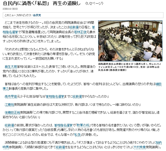 ![]() 自民内に渦巻く「私怨」再生の道険しpage1 page2 どこまで迷走を続けるのか−。8日の自民党の両院議員総会は1時間を超え、怒号とヤジが飛び交ったが、決まったことは総裁選の日程と、首相指名選挙で「緊急避難措置」として両院議員総会長の若林正俊元農水相の名を投じることくらい。半世紀にわたり、政権を担ってきた巨大政党はすっかりその矜持(きょうじ)を失ってしまった。「落選議員の会開いて…」 選挙終わって政治家ブログ活発 首相指名、自民は若林・両院議員総会長 昨日、自民党の両院議員総会が開かれた。TVニュースを見たが、冒頭麻生氏の挨拶はまったく責任を感じていないのか?「われわれは野党になるんだからその決意をきちんと示さなければならない」などと何をどこまで自覚しているのか?エラソーに言っていた。(笑)特に反発はなかったようだ。誰ももう見向きもしない!2度と出番がない相手を完全に無視しているように見えた。 すったもんだした首班指名は・・・とりあえず両院議員総会長の若林氏で決まったそうだが、かといって次期総理の目があるわけでもない。 周りから見れば野党になり、どうせ意味のない首班指名なんだからなんでもいいじゃないか?と思うのだが、惨敗に対する怒りが収まらないようだ。